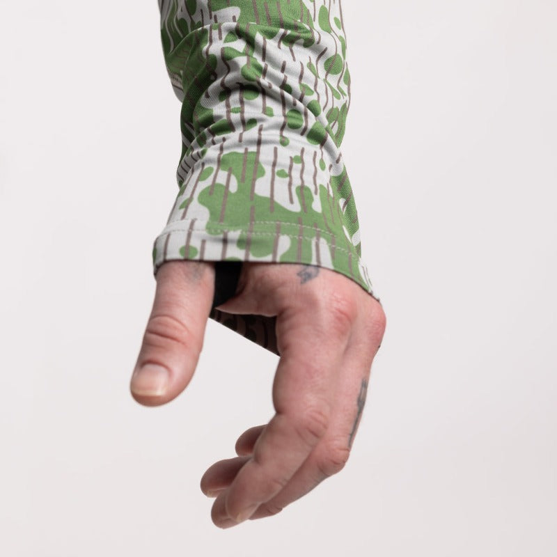 Designed with wrapped side body panels and raglan sleeves, the loose fit allows for casual comfort and flexibility of movement. The sleeve cuffs are complete with elastic thumb loops that make it easier to wear gloves while you're cutting up your catch! Enjoy the clean finished inside back neck with its low-profile elastic neck tape and screen-printed branding. Tonal trims, logos, and stitching help pull it all together for your outdoor endeavors.